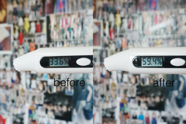 我在手上做的实验,水分值是用前33.6%,用后59.4%,补水力很强。