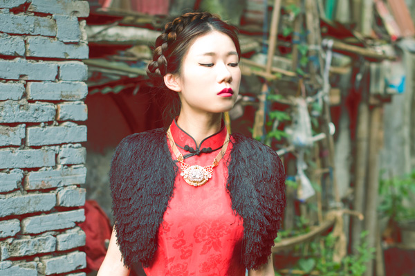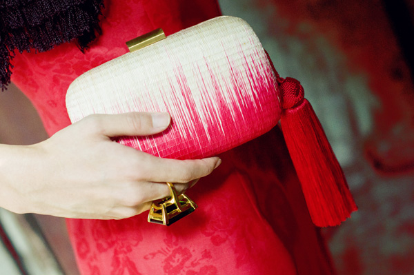 这是件红色的旗袍,搭配了流苏坎肩和复古宫廷项链,渐变草编手包上的红色流苏与旗袍相应,蹬上黑色高跟鞋,既复古又潮流。