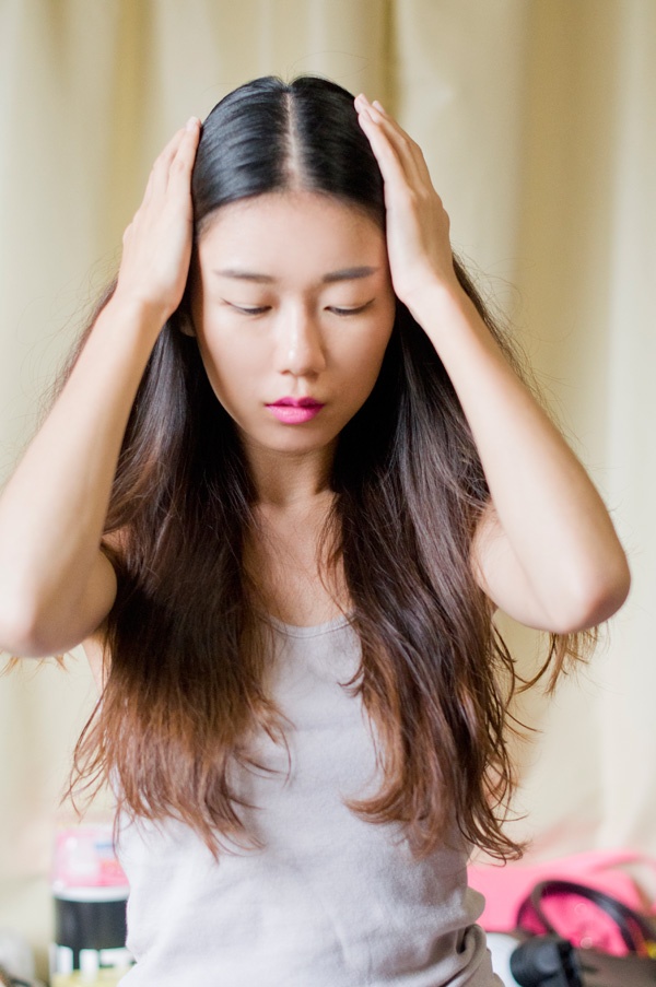 5.将这簇头发顺着头型放到脑后,左手挑起一部分头发。