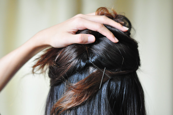 6.用发夹把这簇头发固定于挑起的头发下方。左边的头发也是同样操作。