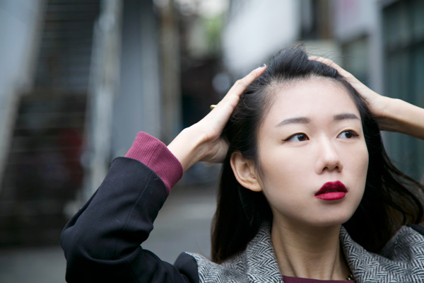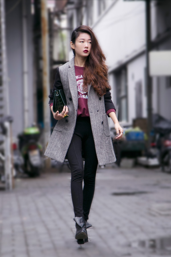 今天又是主打复古红,红与黑的搭配可以从各种红上入手,搭配绿色包包,即帅气又有色彩感。但是用的都是暗色,所以更加沉着。