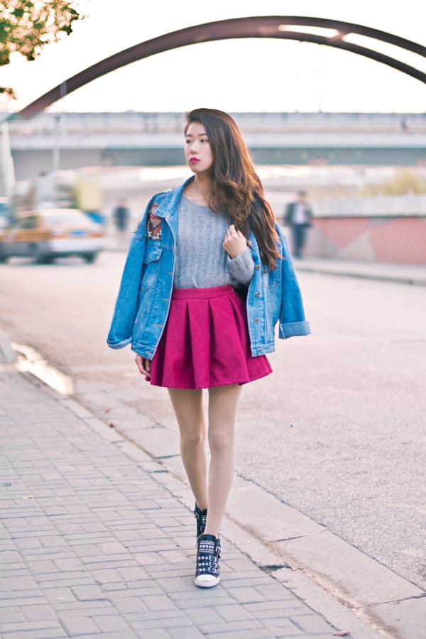 唠叨了那么多,说一下今天的搭配吧,灰色毛衣搭配玫红色短裙,高腰的穿法拉长了下身的比例。外搭休闲的牛仔外套,和裙子撞色,加上铆钉坡跟运动鞋,整身都很休闲。