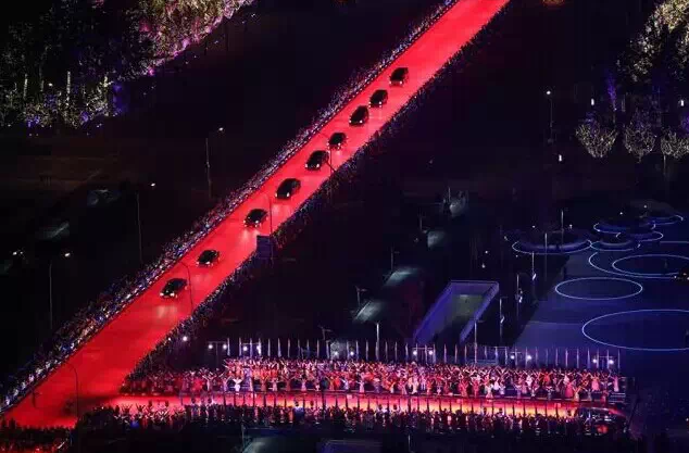 ▲11月10日晚,出席亚太经合组织领导人非正式会议的经济体领导人和代表车队抵达北京国家游泳中心“水立方”。摄影:金立旺 / 新华社