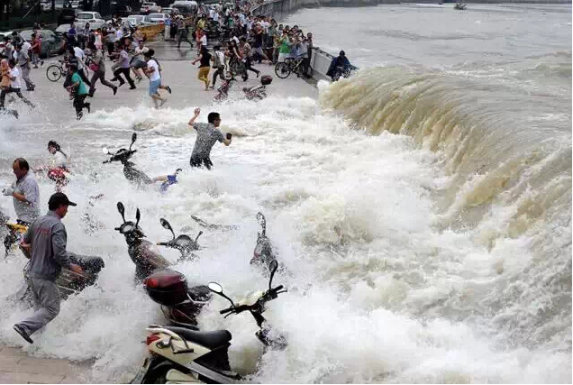 ▲8月15日,钱江潮水在杭州九溪江堤掀起巨浪冲向岸上的游客,一名观潮者抵御住潮水的冲击,站在水中用手机拍照。摄影:梁臻 / 新华社发