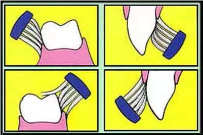 具体的力量应该是多大呢?高级一点的电动牙刷会有力量过大的报警提示。手动牙刷的话,牙刷毛应紧贴牙齿,刷毛尖端1/3受压弯曲,深入到牙齿周围的边边角角中。类似这个感觉: