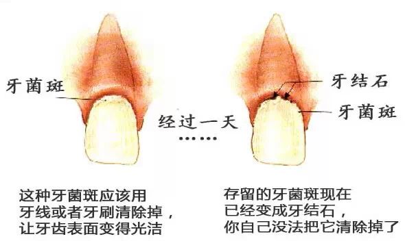 牙菌斑就是细菌在牙齿上的存在形式,像一块膜一样,紧紧黏在牙齿上,是牙石的前身。