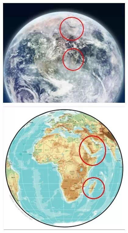 非洲大陆东北角上,那狭长的红海,和东南角上的马达加斯加岛,我都用红圈标注了出来。通过对比,这是一望而知的事情。两张图的区别在于,地图是在赤道上空看地球,而照片要偏南半球很多,以至于欧洲被挤到了图片之外,相反是南极洲在图片下方占据了大量面积。