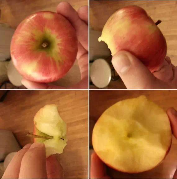 网上的一部叫做“如何牛逼地吃苹果”视频里,Elie Avrouth从苹果屁股开始吃上去,吃完了整个苹果,就像牛人们吃苹果不吐核一样。Elie Avrouth说,如果你试着这样吃苹果,你会发现苹果核消失了。