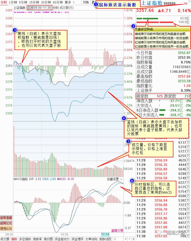 这是普通的通达信软件显示的大盘分时图,键盘直接按F3就显示了,今天我们说说这分时上面值得注意的细节,其实上图中已经标注的差不多了。