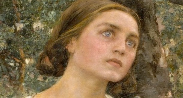 再来看主角贞德。她显然是一个平庸的当地村姑。窄脑门,高颧骨,方下巴,厚嘴唇,低垂着眼皮,淡蓝色的眼睛-法国北部村姑的典型长相。她应该是正在做什么农活。听到声音匆匆赶到这儿来。她身体前倾,左手无意识地抓住树上垂下来的藤条。她听得那样认真,投入。此刻的贞德,她的眼睛里流露出心灵中人性和神性完美的平衡。此刻这个平庸的村姑,让观众对她充满了敬意。