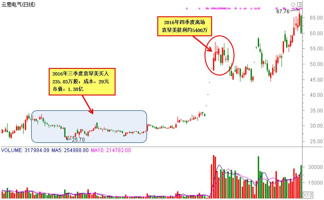 袁琴美于2016年三季度巨资买入235.03万股云意电气,成本约29元,市值高达1.38亿。该股2016年11月连续收出四个一字涨停板,袁琴美同年四季度获利出局,盈利约5400万。