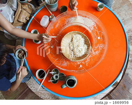 在自己家里吃素面虽快捷实惠,总不如去外面吃真正的流水素面风雅。提供流水素面的餐厅大都位于宽敞通风、景色美丽的地方,桌上的旋转盘里清水潺潺,白色的素面如团团细细的丝带,永无间断的涌过来。用筷子夹,需要手眼配合,一次只能夹住一小撮;用筷子拦,团团的素面被拦住腰动弹不得,乖乖地被夹进碗里,一出溜进了肚子。怎么吃就看你的喜好了。