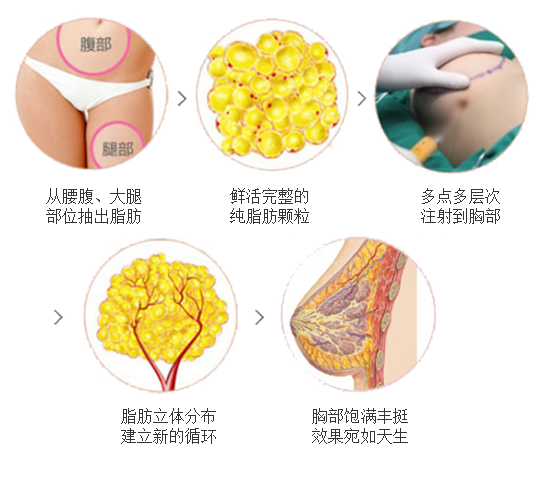 利用高清晰逐层扫描吸脂术,从腰腹、大腿部抽取鲜活的高纯度脂肪颗粒,利用多点多层次立体式注射的办法填充到胸部,填充的脂肪建立新的血液循环系统,术后胸部饱满丰挺宛若天生。