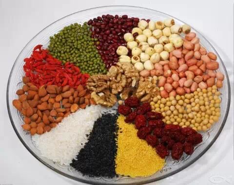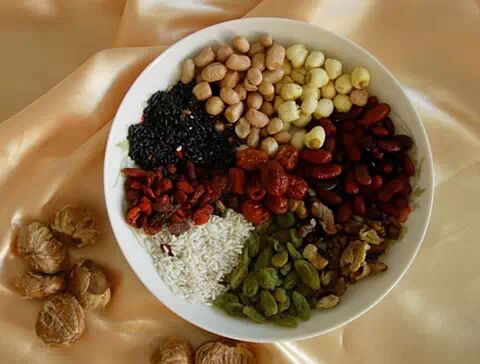 主要原料是大枣、黑豆、花生仁、核桃、黄豆、青豆、松子仁、莲子、桂圆肉、粳米等。