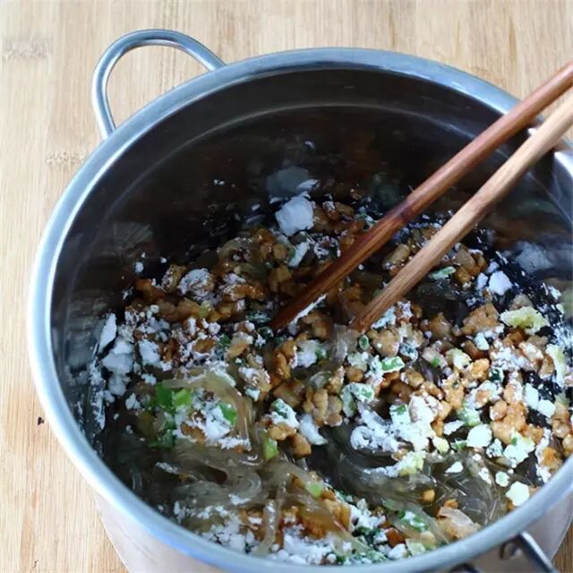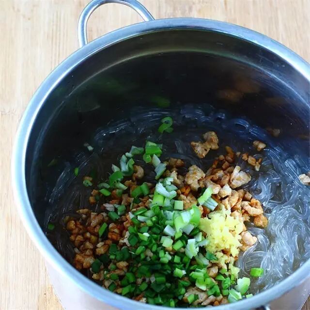 材料很简单,五辛里用了四种,切菜的时候味道就大起大伏,吊足了胃口。爆香的肉末裹上晶莹滑嫩的粉条,掺着韭菜碎、大葱碎、炒香的蒜末姜末,还有花椒香,再入锅蒸熟,让几种香气充分混合,出锅打上一个蘸水,多辣多酸随你口味,一个人的一顿饭就这么隆重美味的解决了,费的不是油,是饭!