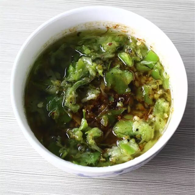 捣碎的生辣椒经过作料的浸泡已经回软,所以不会有很刺激的生菜味,加上青花椒、黄姜、大葱的调配,很有田野气息哟~