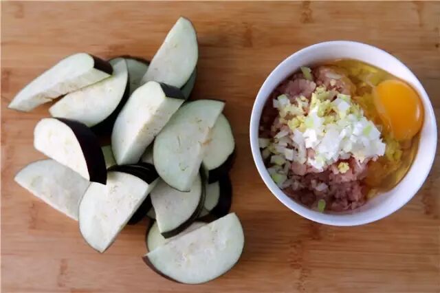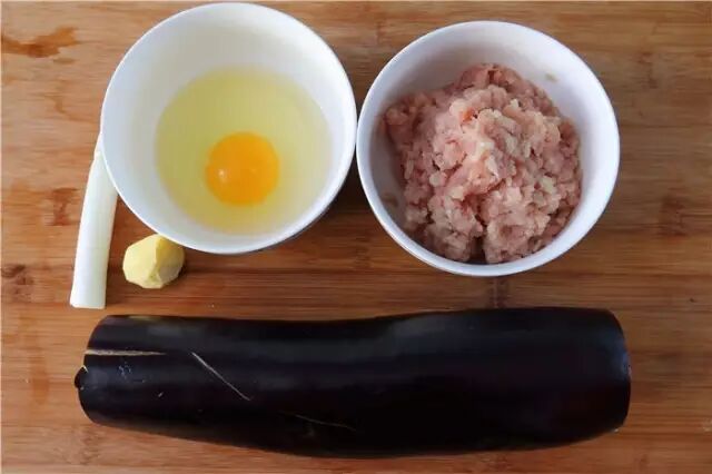 原料:茄子1根 磕开的鸡蛋1个 肉馅儿半碗 大葱1段 鲜姜1小块