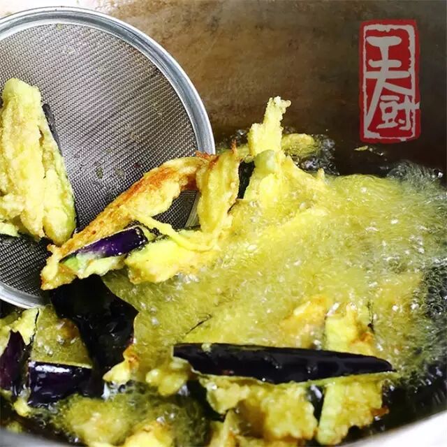 划重点:挂糊要均匀,茄子炸黄即可起锅,太干就成柴了。起锅后要沥干油,吃的时候才不腻。