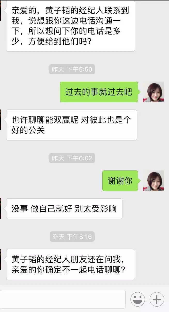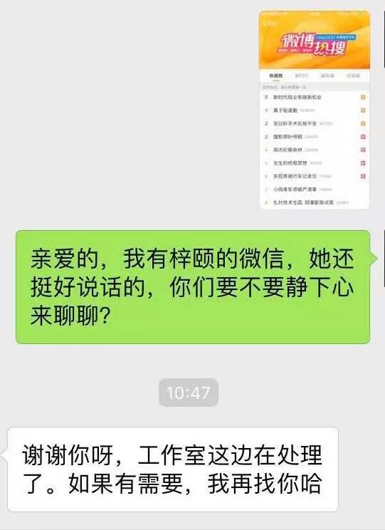 10:38 有人搭桥希望帮忙沟通。叶梓颐表示也一直希望联系对方,但是黄子韬工作室表示拒绝。