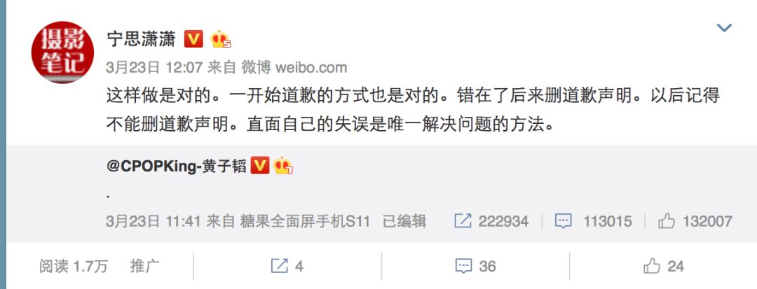 12:11 黄子韬修改微博,第一次道歉。