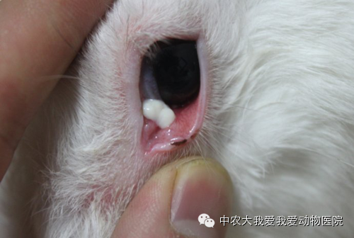 5、上切齿牙根过长引起兔子泪溢,眼分泌物增多,牙根压迫鼻泪管导致鼻泪管梗阻应勤剪牙齿,不要使牙根过度生长占位鼻泪管。严重者采取拔除上切齿。