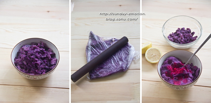 紫薯蒸熟,去皮,放凉,入保鲜袋系好,用擀面杖擀成泥。