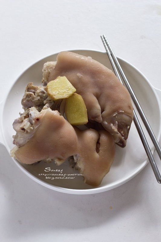 烧开水,放入猪脚,加入几片姜和一小勺米酒,中小火煮十分钟去血水,捞出。