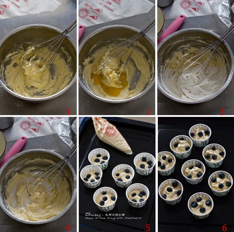 5、装入裱花袋,挤入纸杯1/2面糊,放三四个新鲜蓝莓。