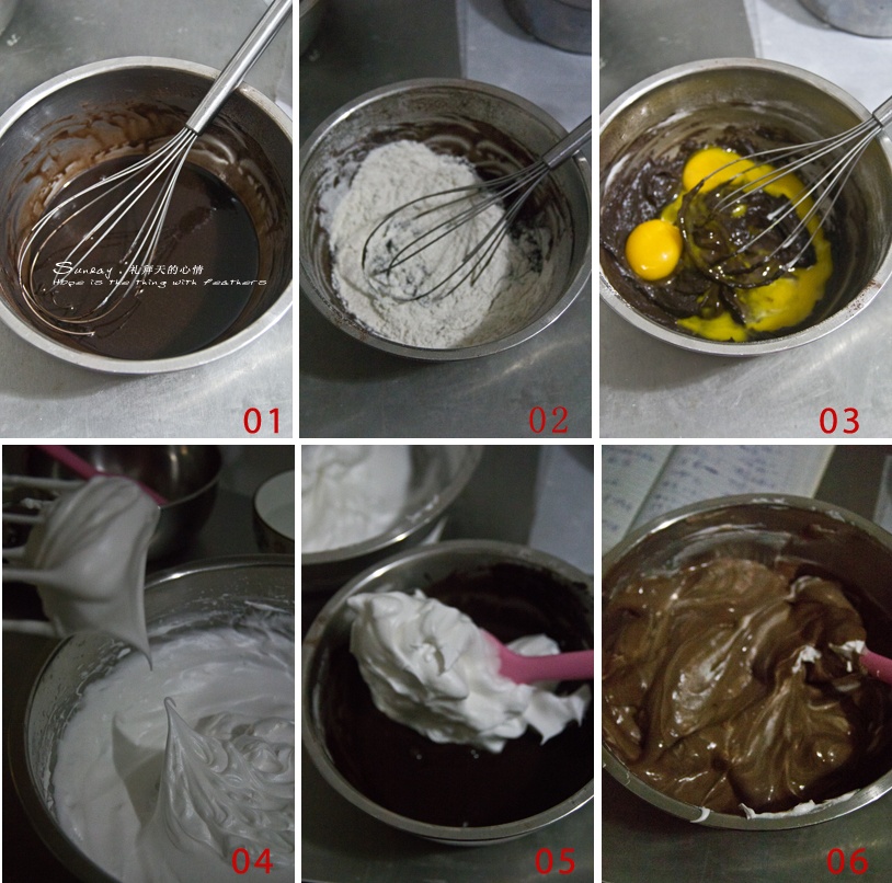 5、取三分之一蛋白霜,拌入可可蛋黄糊。