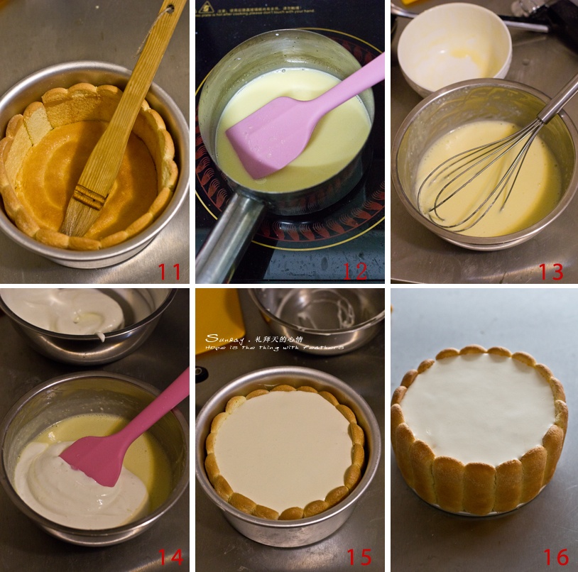 12、蛋黄2个+牛奶300克+细砂糖80克放小锅内,用小火一边煮一边搅拌,