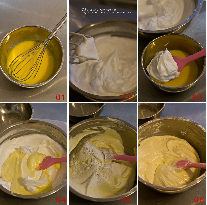 4.再倒回剩下的蛋白霜内用橡皮刮刀翻拌均匀。