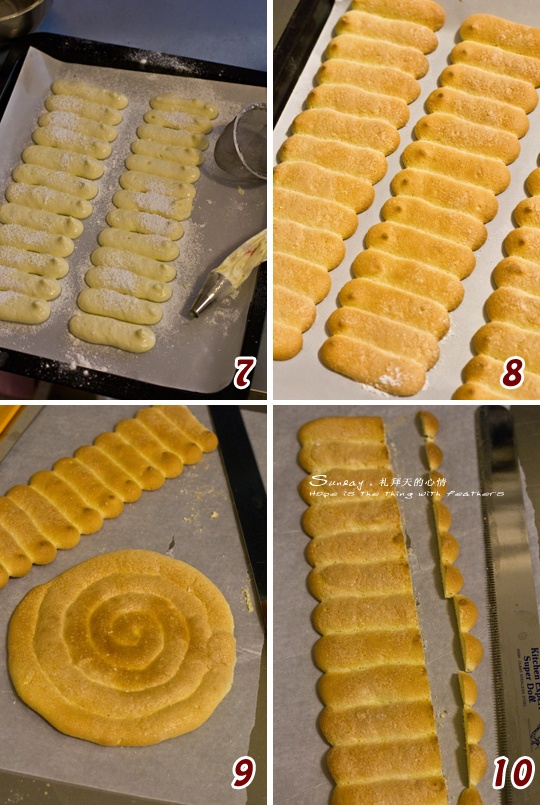7、将蛋糕糊装入裱花袋内,用圆形花嘴在铺有油布的烤盘上挤成相连,整齐的带状。