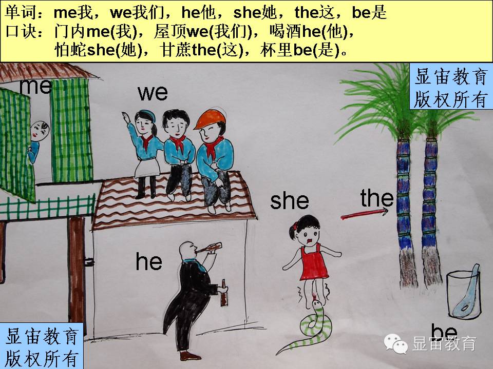 口诀:门内me,屋顶we,喝酒he,怕蛇she,甘蔗the,杯里be。