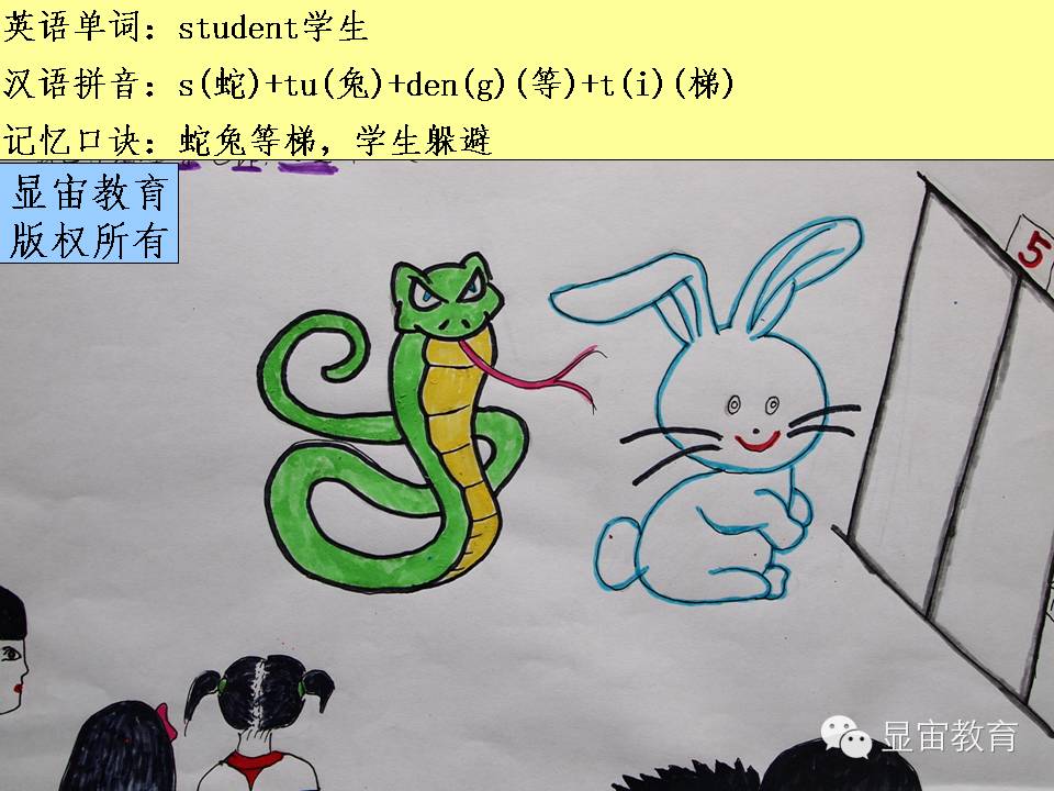 (请注意这里面“S”是用它的直接形象“蛇”来代表的,“den”是用“等”、“t”是用“梯”来代表的,它们在汉语拼音中不完全相等。这种情况在记忆过程中只需要注意一下即可,我们在回忆时能够自动把它还原。)
