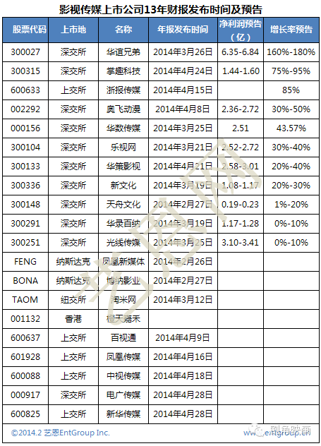 根据影视传媒公司13年的年报预告数据显示,所有公司的预估净利润都呈现增长态势,幅度略有不同。其中,预估净利润增幅最高的是华谊兄弟,预计增幅为160%-180%, 掌趣科技位居第二,增幅为75%-95% 。这也反映了过去一年的投资热点——电影和手游行业。2014年,以电影为龙头,新媒体为两翼的影视传媒板块,将继续爆发出强劲的生命力。