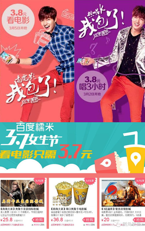 今年“三八档期”的意外走俏,不仅和电影消费整体走高的惯性有关,同时也是得益于电商砸下亿元补贴,包场“请用户看电影”的强势营销。据悉几个月前,淘宝就同多家院线敲定,包下8大城市近300家影院,请用户看电影。随后,网易商城、百度糯米也加入混战,以3.7元票价叫板,与此同时还推出3.7折电影票、团单满37元减3.7元等多种优惠。