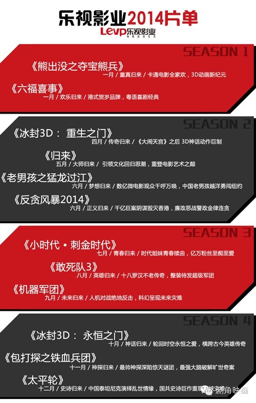 3月13日下午,乐视影业在京召开年度峰会。会上宣布陆川正式签约该公司。张艺谋也现身峰会,称《归来》将制作IMAX4K版,这也将是国内首部采用IMAX4K技术制作的影片。乐视影业还公布了2014年完整片单,包括《冰封•重生之门》、《敢死队3》、《小时代3》、《太平轮》、《老男孩之猛龙过江》等,预计年票房30亿元。