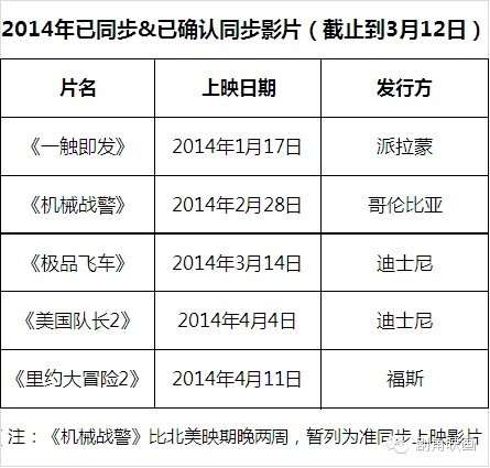据悉,蓝天工作室与20世纪福斯联手打造的续集3D动画《里约大冒险2》将于4月11日在内地上映,与北美同步。2014年内地同步北美上映的影片数额有了明显增加,去年是3部,今年刚过不到三个月已经有了5部(含准同步),期待这一趋势能够延续。