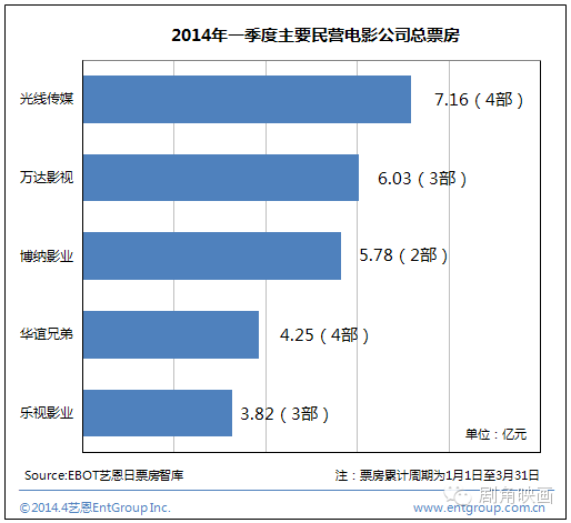 2014年第一季度,华谊、光线、博纳、乐视、万达五家公司合力贡献票房超27亿,约占一季度国产片总票房的64%。其中,光线以7.16亿夺得冠军,万达影视以6亿紧随其后,博纳则以《澳门风云》、《盗马记》两部影片产出5.78亿,位列第三。《爸爸去哪儿》、《澳门风云》、《北爱》、《熊出没》、《前任攻略》等分别代表各公司进入国产片票房TOP10。