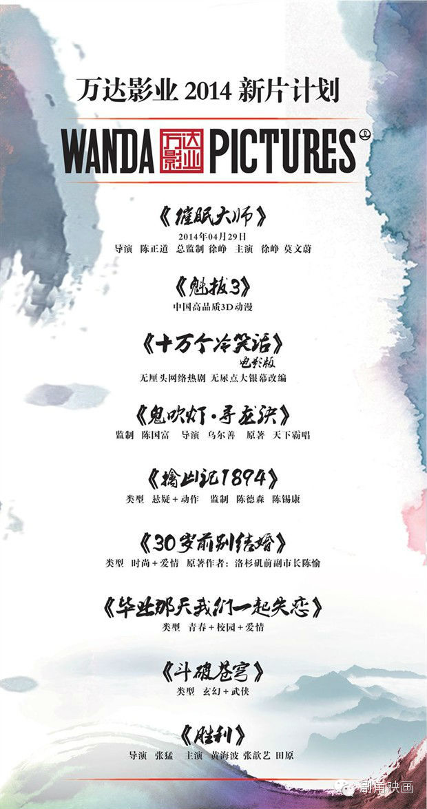 4月1日,万达影业发布了“2014年新片计划”,一共9部新片,其中既有五一档的《催眠大师》、冒险电影《鬼吹灯·寻龙诀》,还有动漫品牌新作《魁拔3》,也有《十万个冷笑话》大电影版、《30岁前别结婚》、《毕业那年我们一起失恋》、《擒凶记1894》、《斗破苍穹》和《胜利》,作品类型横跨悬疑、动作、爱情、冒险和动漫等各个领域。