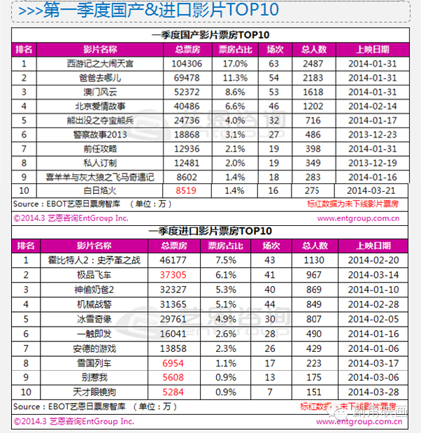根据艺恩咨询发布的数据显示,2014年第一季度总票房67.23亿,同比增长30%,其中国产片占比64%,领先进口片票房收入约20亿,该季度上映的100部左右影片中,有32部的票房超过了2000万,分别有8部国产片和7部进口片票房过亿。在经过春节档和情人节档爆发后,国产片票房于3月开始降温,期间没有一部影片当月票房过亿,而进口片则连续5周占领周票房榜冠军宝座。另外,截至3月,全国新增影院325家,新增银幕1609块,累计银幕20007块。中国电影已迈入2万银幕时代。