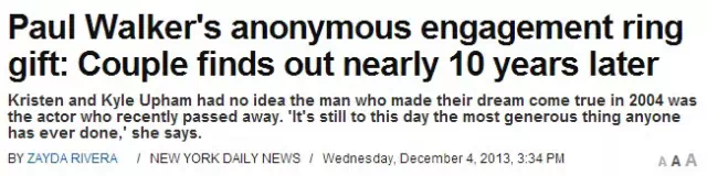 后来,这件事得到了珠宝店店员艾琳·金的确认:当保罗·沃克听说一位退伍军人无法给他心爱的女友买下订婚戒指,他便买下了这份价值1万美元的礼物,并让店员送给了凯尔和克里斯汀。