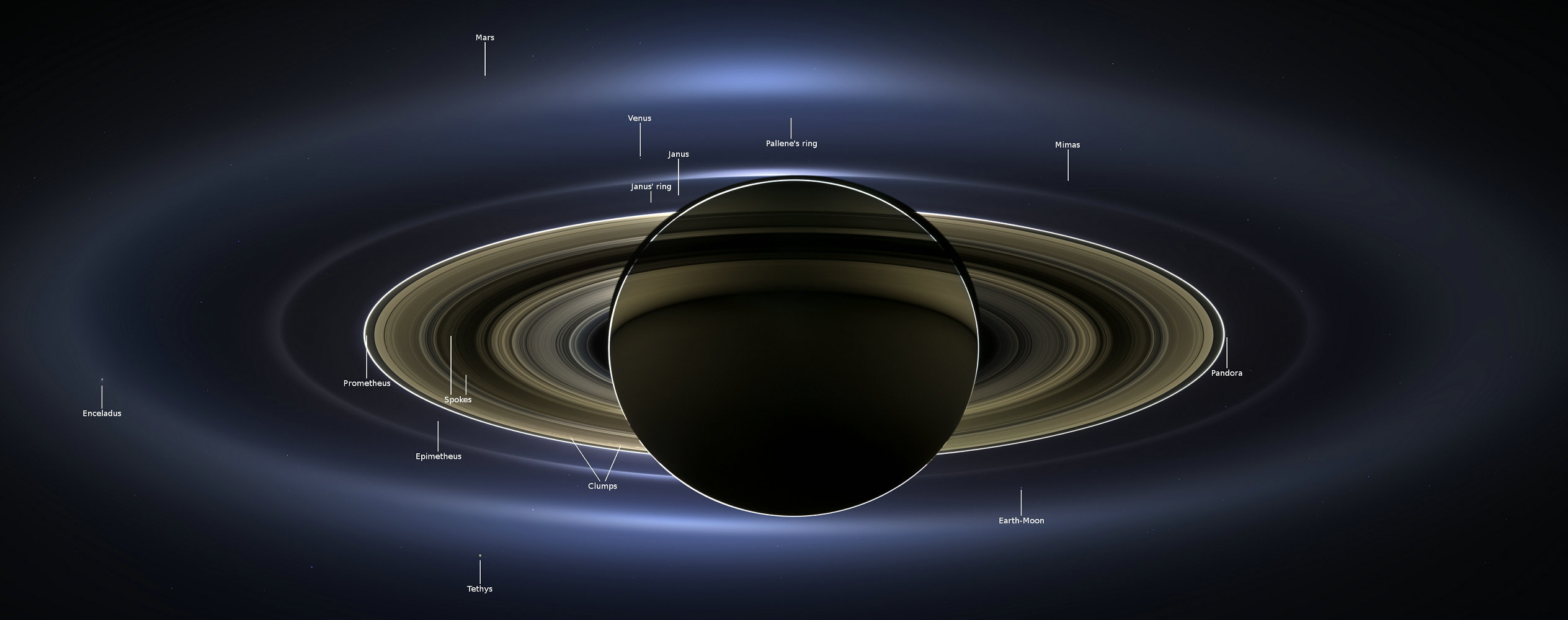 卡西尼号科学家,来自爱达荷大学的马特·赫德曼(Matt Hedman)说:“这张叠合图片提供了有关土星环系统的大量高质量数据,揭示出许多我们正试图了解的有趣结构。”图片显示了卡西尼号在土星附近看到的太阳系的情景,这与人类肉眼看到的景象是一样的。