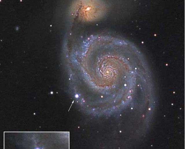 2011年,一个业余天文学家在梅西尔51漩涡星系发现了一颗超新星,距离我们大约2.57亿光年。这颗超新星也被命名为SN2011dh,通过光谱分析发现,SN2011dh前身是一颗超巨星,质量超过太阳的13倍,事实上也有一些证据显示其前身为双星系统。科学家之所以对超新星爆发后的残骸如此感兴趣,主要原因是我们可以通过其冲击波形成的物质扩散轮廓、膨胀速度来推测这是哪种超新星,不同恒星死亡后的遗迹有所区别。