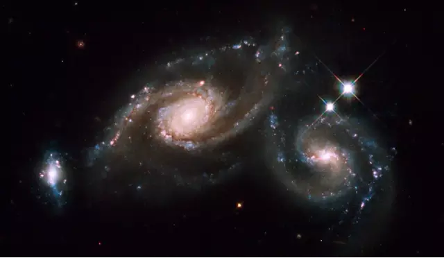 旋涡星系之间一旦发生相互作用,紧随而来的就是声势浩大的造星运动,它们的旋臂在此时通常会变得格外粗壮。
