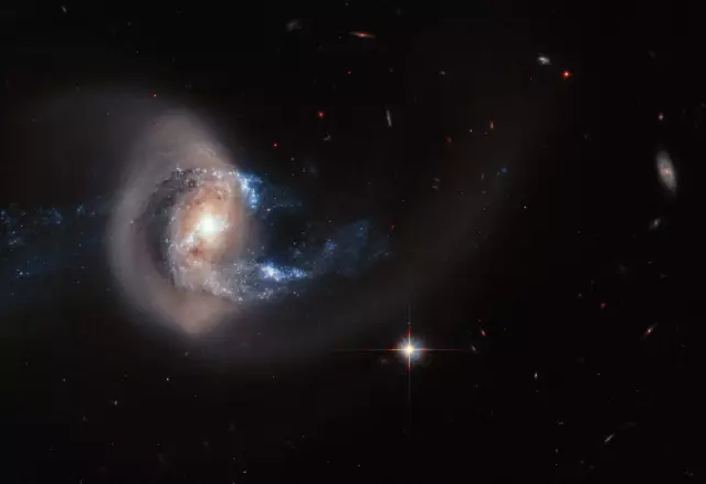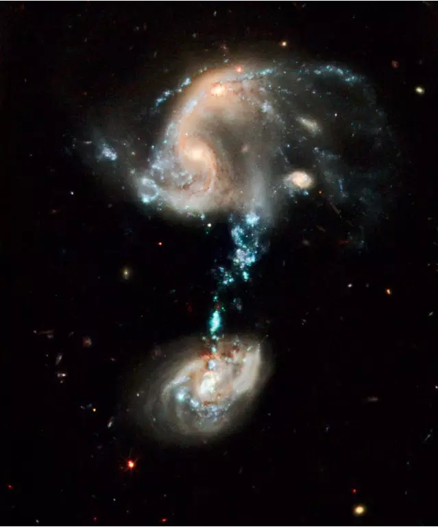 阿普273,两个相互作用的星系都受到了明显影响。来源:哈勃
