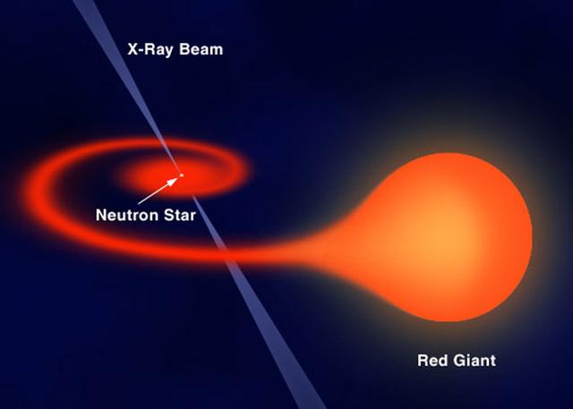 中子星可存在于双星系统中,当伴星炽热的气体物质沿其磁力线汇集并高速撞击到表面时,就会辐射出高能X射线,辐射点伴随着中子星的旋转而旋转,形成脉冲的X射线信号,这就是X射线脉冲星。另一方面,当伴星的物质落到中子星的时候,就像用皮鞭抽打陀螺一样也能加快中子星的旋转。