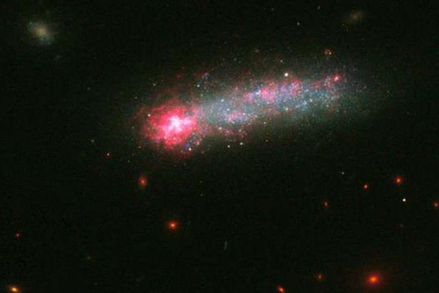 腾讯太空讯 据国外媒体报道,NASA的哈勃天文望远镜近日在附近的一个小星系里捕捉到了壮观的烟火盛放。恒星诞生的大爆发点亮了小型星系Kiso 5639的一端,Kiso 5639是银河系附近一个稀有的细长型星系,这种星系通常在更遥远的地方才会大量存在。天文学家表示,这种疯狂的恒星诞生现象是由于星系间的气体从星系的一端穿越整个空间所刺激形成的。瓦瑟学院的首席研究员Debra Elmegreen表示,在很早以前银河系附近应该也存在许多这类细长型星系。