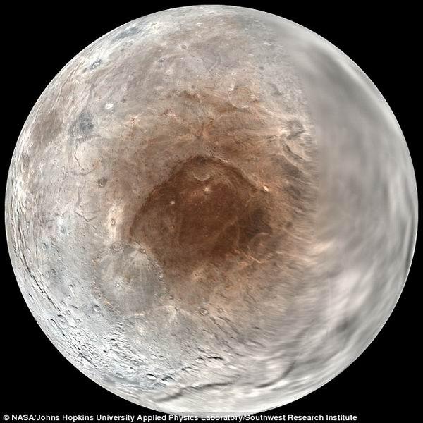 美国宇航局“新视野号”探测器最新观测显示,冥卫一北极覆盖着大量暗红色斑块,专家分析称,这些神秘暗红色斑块可能是来自冥王星大气层的固体甲烷物质。