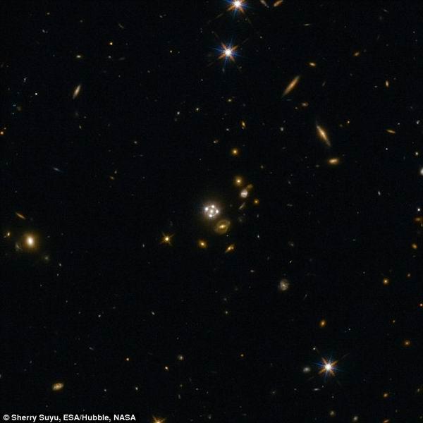 研究小组使用哈勃太空望远镜观测3个星系,它们作为“引力透镜”,每个星系可以弯曲遥远类星体的光线,图中是E0435-1223类星体,它是迄今观测透镜效果最佳的类星体之一。